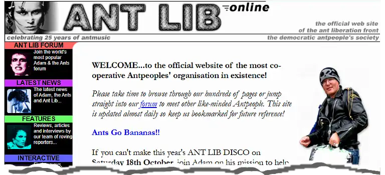 Oh, there you are! It’s been a while since Ant Lib Online went *pop!* following a few years in digital limbo. After taking time out from the relentless updates following the Adam Ant revival of 2010-11, the website hung on until – like all old bangers – the back-end finally went and it got covered up in the garage, quietly rusting offline1.