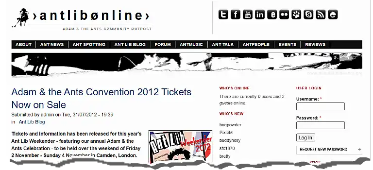 If you made it this far down the page, thank you! However, there’s a long way to go and instead of relaunching in a flurry of whoops, whistles, coconuts and perfection, the new Ant Lib Online is very much a work in progress. Consider the current homepage as a mood board of ideas inspired by the responses from last year’s Ant Lib Survey; the Archive the start of a repository of classic Ant Lib interviews (going back to the very beginning) and starting point for future articles; the new Events calendar as a social hub promoting the spirit of the live Ant experience, and of course Membership5 will eventually open up more perks for being part of a (re)new(ed) Antpeople’s movement.